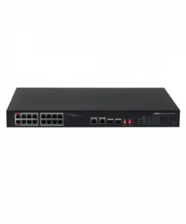 The Dahua PFS3218-16ET-135 16-port PoE Switch + 4 RJ45/SFP combo ports is a cost-effective Layer 2 PoE switch that has been developed for IP surveillance systems. The PFS3218-16ET-135 is equipped with 16 RJ45 10/100Mbps ports with PoE 802.3af/at (power over ethernet) support and 2 RJ45 Uplink 1 Gbps shared (Combo) ports with 2 SFP insert ports. The total PoE power budget for connected devices is 135W. The device supports IEEE 802.3af, IEEE 802.3at and Hi-PoE standards (first 2 ports).