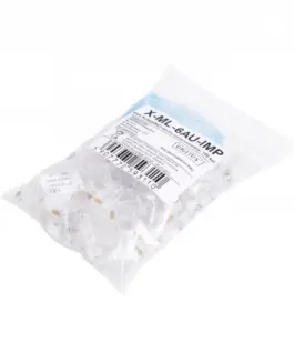 The RJ45 connector (8P8C type connector) is the most common connector for the construction of wired local area networks in the Ethernet standard. The universal connector with the symbol X-ML-6AU-IMP can be mounted on a category 6A unshielded cable of wire or cable type. The transparent housing of the X-ML-6AU-IMP plug is made of high quality polycarbonate, ensuring very good mechanical parameters. The contacts of the plug are made of copper alloy covered with a layer of gold. The plug is designed for cables of circular construction with conductor AWG 24-26, and can be used for conductors whose diameter, including insulation, ranges from 0.94 to 1.00 mm.