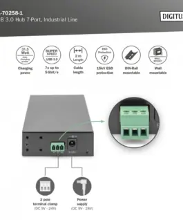 The DIGITUS Industrial USB 3.0 Hub is ideal for industrial applications thanks to its metal housing. It can be wall-mounted or mounted on a mounting rail and connected to a Компютър, Лаптоп, or server using the included USB 3.0 cable. It supports the USB 3.0 SuperSpeed standard with data transfer rates of up to 5 Gbps. It is also backward Съвместим с USB 2.0 and USB 1.1. The hub can be powered via a two-wire terminal block connection (+9V to 24V). An external захранващ блок can optionally be connected to the DC jack.