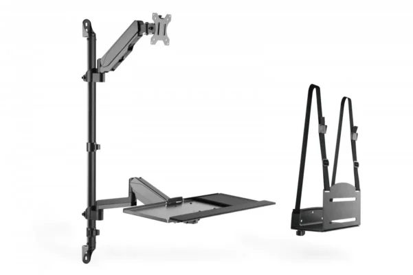 Universal wall mount for mounting a monitor, keyboard / mouse and PC with flexible working height adjustment. Prepare a workplace that can accommodate multiple people’s working height despite the difference in height thanks to the three quick steps. Two integrated gas springs make adjusting the height of the monitor and keyboard shelf child’s play. The set includes a PC holder for wall mounting.