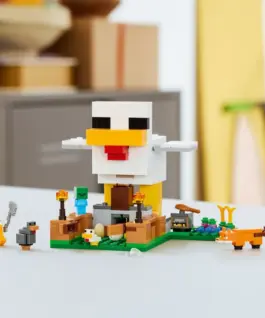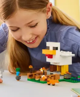 Take care of chickens and grow crops with the LEGO Minecraft Chicken Farm set (21585) for girls and boys aged 7 and up. This kids building set challenges players to look after an adult chicken and a baby chicken alongside a Chicken Lover minifigure, while also dealing with a fox (which likes to eat adult chickens) and a baby zombie (which likes to ride chickens).