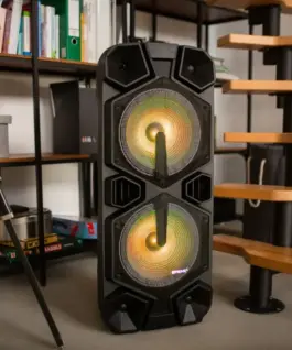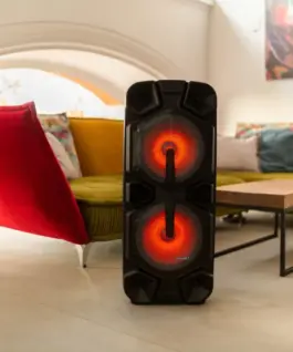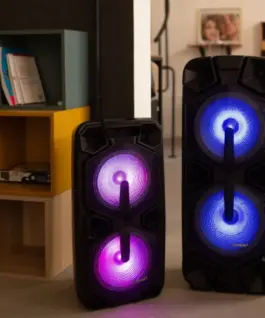 The karaoke function, with a 6.5 mm microphone jack, used in all professional sound systems, an additional wireless microphone and multi-Цвят LED backlight is an option that will spice up any social meeting. Thanks to these functions, we can play the role of our favorite music star and shine in the spotlight. However, the loudspeaker will work not only during karaoke games, but also in any situation where we want to be heard by a larger audience, e.g. at meetings, matches, in a lecture hall or during a school assembly. Thanks to the built-in battery, the device can operate both in wireless mode and when connected to the mains захранващ блок. The use of batteries allows you to take the speaker outdoors and organize a fantastic party also outdoors.