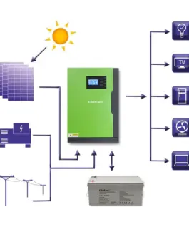 The off-grid hybrid inverter combines the solar PV system, energy storage and the power grid. During the day, it charges the energy storage from the photovoltaic panels. The energy storage unit powers household appliances from the stored energy during the day, and when the batteries are discharged, it draws energy from the grid.