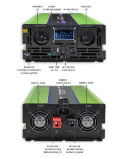 Qoltec brand inverter is a pure sine wave, produces the same current as a 230V socket, ensuring safety for all connected devices . Great for both during power outages, as well as during travel when we do not have access to an outlet. When choosing a suitable inverter, it is worth paying attention to the power value and voltage of the battery, which must be consistent with that indicated on the inverter to ensure that our equipment has the right conditions for work. Also important is the number of connected devices, for example, connecting a Лаптоп and a printer, the power of both devices should be added up. Remember that the power consumed by the connected device should not exceed 85% of the rated power of the inverter.