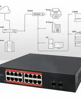 Experience a reliable and efficient plug-and-play network device. With 16 x 10/100/1000 Mbps ports with PoE function and 2 SFP (fiber 1000 Mbps) ports, the device allows you to create a flexible and scalable LAN – without unnecessary power cables, external power supplies or additional switches.