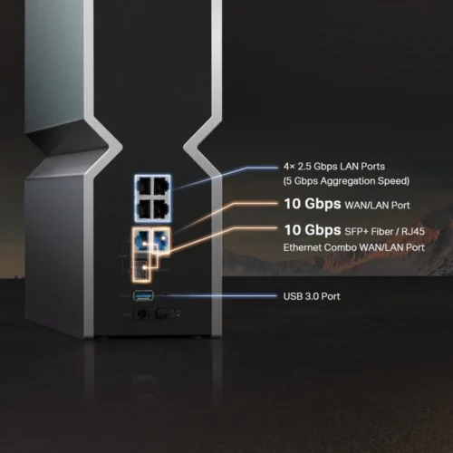 - Dual 10G ports: 1 x 10Gbps Ethernet/Fiber Combo WAN/LAN port + 1 x 10Gbps WAN/LAN port + 4 x 2.5Gbps ports + 1 x USB 3.0 port for maximum flexibility and increased bandwidth.