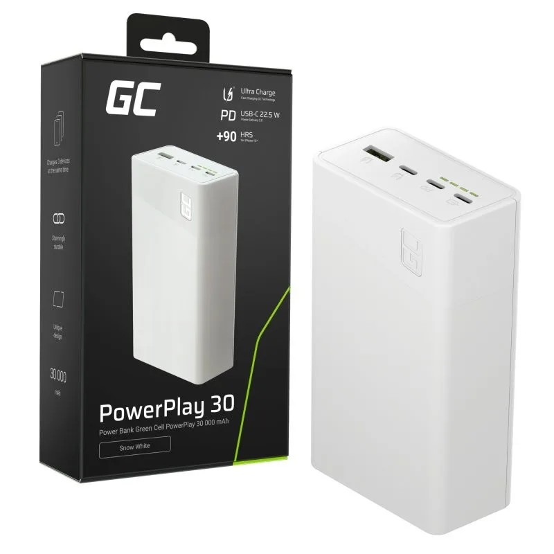 Green Cell външна батерия 30 000mAh, 22.5W, 4 ports, бял