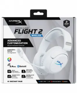 HyperX Cloud Flight 2 illuminates every game with full-surface RGB lighting and magnetic earcups that you can quickly swap without tools and without interruption in-game. Change the look, save a single lighting profile directly to the headphones, and customize them to your playstyle, rank, or streamer setup. Built for durability, turn off the lighting to conserve battery life and play for up to 100 hours on 2.4 GHz or 150 hours on Bluetooth. Instant Pair connects to select OMEN Лаптопs without a dongle, while a simple switch lets you switch between 2.4 GHz and Bluetooth wireless modes. Stay comfortable throughout your entire game with памет foam cushions, 90° rotating earcups, and durable steel sliders that stand up to everyday use. Angled 50mm drivers deliver immersive, gaming-optimized audio. Use the detachable 10mm boom mic for clear communication, or switch to the built-in mic when taking a break from gaming. Built-in audio, mic, media, and lighting controls provide convenient, menu-free control without distractions. Whether you’re gaming, streaming music or video, browsing Twitch, or doing homework, HyperX Cloud Flight 2 guarantees all-day comfort and style with adjustable RGB lighting.