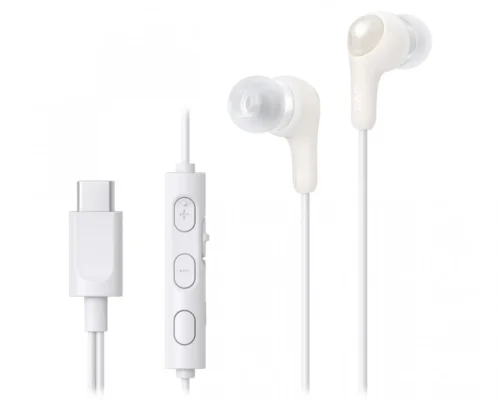 These Gumy Connect wired USB-C in-ear headphones feature an in-line remote with easy-to-press buttons and a microphone on/off switch.