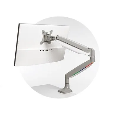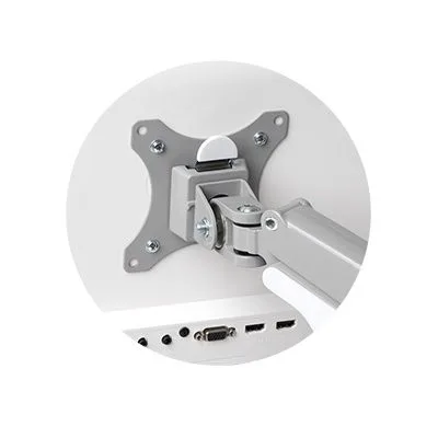 One-touch adjustable arm with built-in gas spring for easy height adjustment (6.7-19.9 or 170-505mm), 180° swivel and monitor rotation, +/- 90° tilt adjustment and smooth monitor upward movement, down, forward and backward for full articulation of movement.
