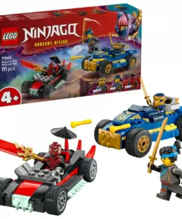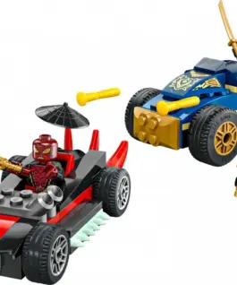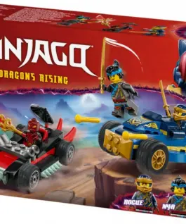 The set includes two vehicles: a ninja car with movable wheels and two stud shooters, and a villains vehicle, ready for crazy races and thrilling battles. It also comes with three NINJAGO minifigures: Rogue and Nya armed with golden katanas, and Drix with a transparent revealing blade.