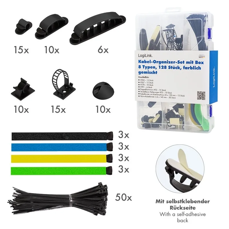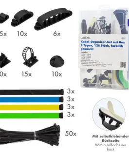 Cable organizer set from LogiLink consisting of 8 different items (cable ties, cable clips and fasteners) in a transparent, clearly arranged transport and storage box.