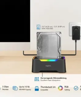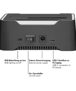 Use the LogiLink USB-C RGB docking station for efficient backups, to rescue data from old drives or to expand your storage for games and media. Home users can use it to manage their photo archives, while IT professionals benefit from the quick handling of changing hard drives. Tool-free installation and the included 2-in-1 cable for USB-C and USB-A guarantee full flexibility on any Компютър or Mac. The open design provides passive cooling and protects the hardware during continuous operation. The dynamic RGB lighting rounds off the functional use with a visual touch.