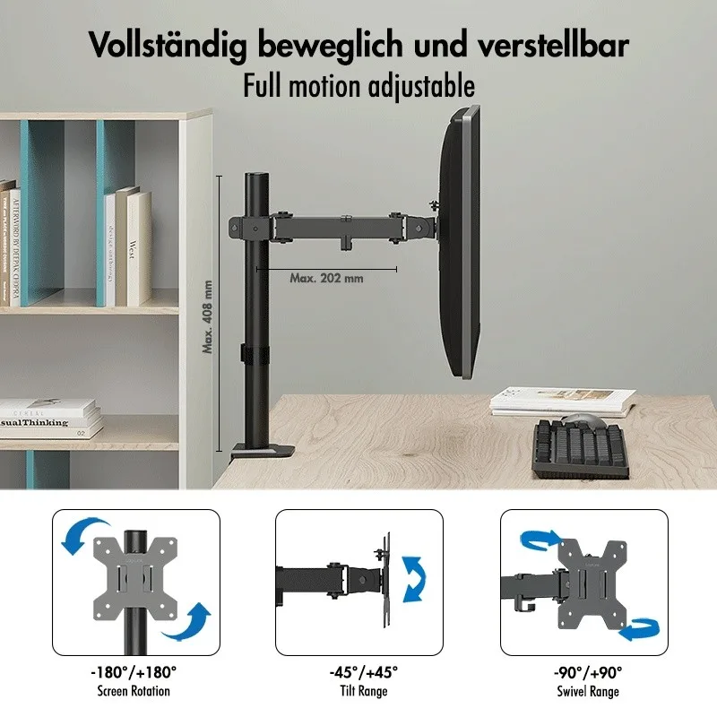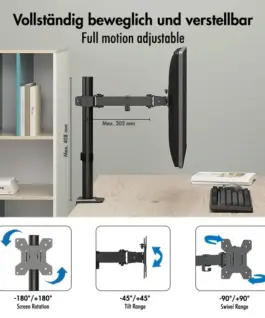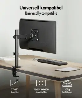 The LogiLink BP0215 is a robust monitor mount for single-screen installation for displays with a diagonal of 17 to 32 inches. The steel and high-quality plastic construction is designed for a load capacity of up to 10 kg. The system enables precise ergonomic alignment thanks to a 40.8 cm high guide column and an articulated arm with a deflection of up to 20.2 cm. With a tilt range of +/- 45 degrees, a swivel range of +/- 90 degrees and 360-degree rotation (pivot function), the mount offers maximum flexibility for different viewing angles and working modes. It can be attached to the Таблетop either with a table clamp or a tear-through fastening. An integrated cable management system and the removable VESA plate for easy installation round off the functional design.