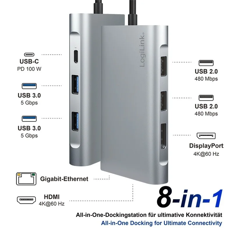 The ideal USB 3.2 docking station with USB-PD 3.0 (20 A/100 W) to connect your USB-C Лаптоп to multiple devices. Connect UHD 4K projectors and monitors to your Лаптоп, connect your PC to the LAN and internet via the Gigabit Ethernet port, and use other USB end devices via the USB 3.0 ports.