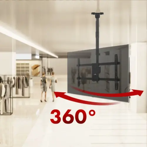 FULL FLEXIBILITY OF ADJUSTMENT – COMFORTABLE WATCHING FROM ANYWHERE The mount offers a wide range of adjustment that allows you to customize the position of your screen exactly to your needs. The tilt angle can be adjusted up to 25° down, and the 180° swivel capability ensures that you can comfortably position your TV in any direction. What’s more, the mount allows you to level the screen within 3°, which is especially useful for minor mounting imperfections. In addition, the angle adjustment at the ceiling up to 60° and the ability to adjust the height provide maximum mounting flexibility.