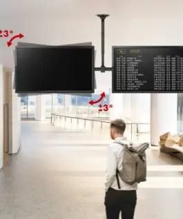 The bracket’s design offers full adjustment – both downward tilt of up to 25° and 360° rotation, allowing for optimal positioning of the screens relative to the audience or users. Telescopic height adjustment allows the mount to match the height of the room, and a 3° leveling function makes it easy to precisely level the screens even after installation. A built-in cable masking system allows cables to be routed aesthetically and safely, which is important especially in public or office spaces.