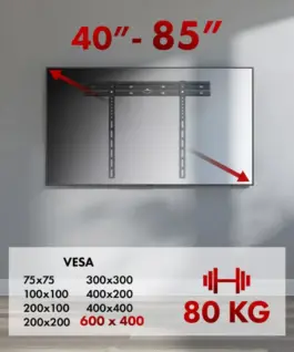 Designed with modern interiors in mind, the Maclean MC-123 ultra-slim wall mount is the perfect solution for those who want to elegantly and securely mount their TV on the wall. Thanks to its minimalist design, it allows maximum adhesion of the TV to the wall – ideal for living rooms, bedrooms or office spaces. The mount fits TVs from 40 to 85 inches and supports VESA mounting standards up to 600×400 mm, ensuring wide compatibility with many TV makes and models. Fits TV brands such as Sony, LG, Samsung, Philips, Sharp, Panasonic, Toshiba, Grundig, Pioneer, JVC, Benq, Sanyo, NEC, Hyundai, Hitachi, among others.