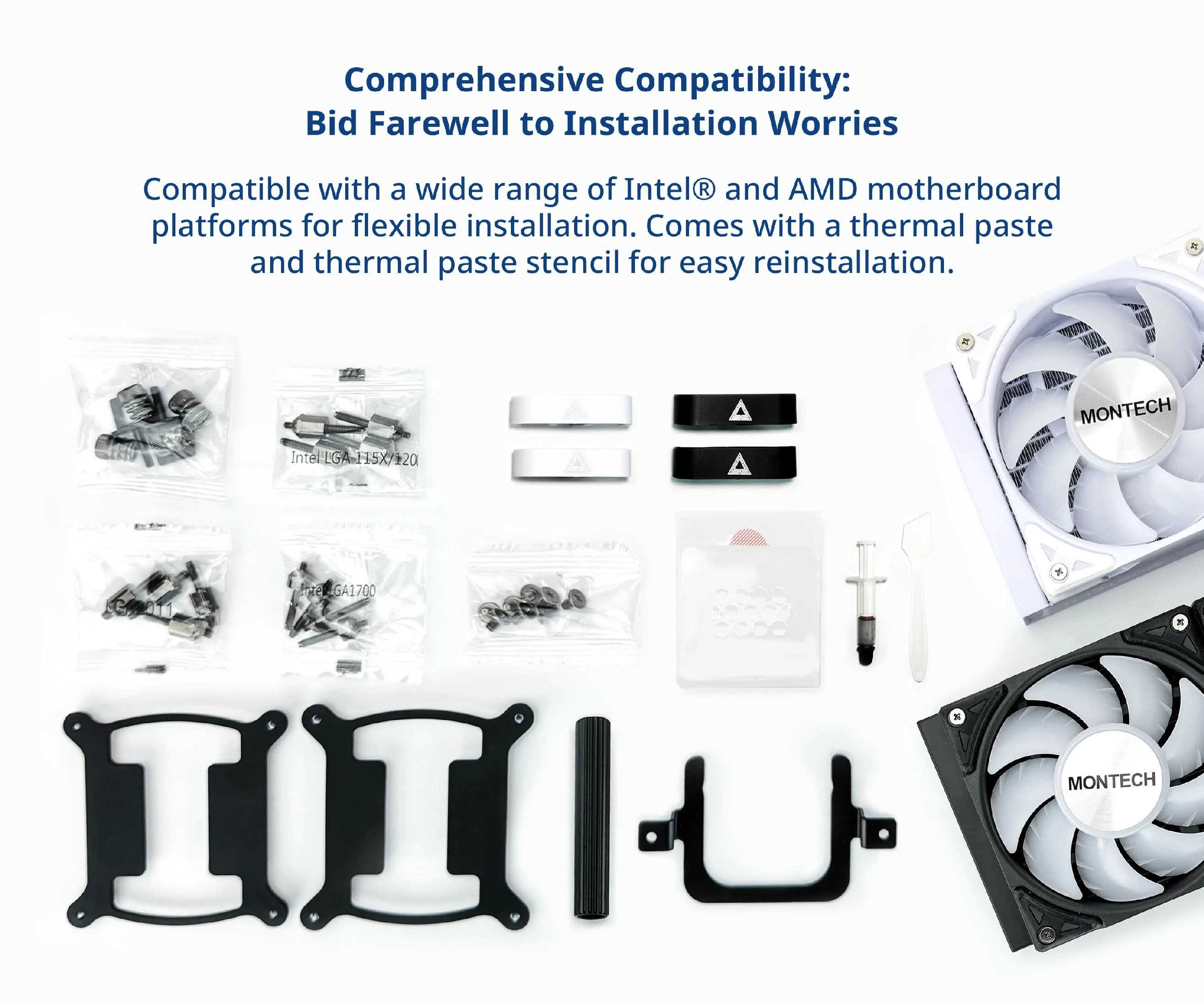 ПРОИЗВОДИТЕЛ : Montech КОД НА ПРОИЗВОДИТЕЛЯ : MONTECH-HYPER-FLOW-ARGB-240-WH ТИП НА ОХЛАЖДАНЕТО : ВодноСЪВМЕСТИМОСТ – Intel : LGA 2066
