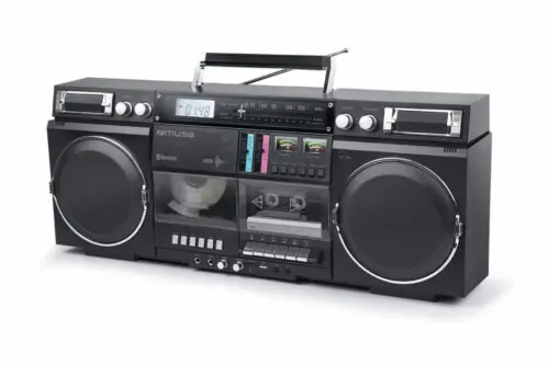 The M-380 GB features an iconic design with vumeters, fluorescent inserts, an extra-large dimension, and a wooden chassis equipped with a foldable handle!