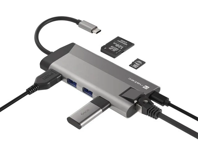 Natec Fowler Plus is a compact microport which enables you to connect whatever you need. It is equipped with 3 USB Тип – A connectors, HDMI 1.4 port with 4K resolution, two card readers (SD and microSD), RJ-45 (1 Gb/s) and USB Тип – C connector with power delivery 3.0 charging standard.