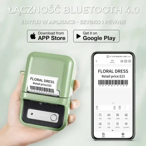 You will receive the Niimbot B21 printer, a 50×30 mm label starter roll, a charging cable and a user manual in Polish. Rolls for the printer are available in our shop. The printer supports rolls up to 50 mm wide and can also print on ordinary thermal paper.