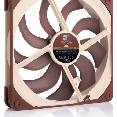 ПРОИЗВОДИТЕЛ : Noctua КОД НА ПРОИЗВОДИТЕЛЯ : NF-A14x25-G2-PWM РАЗМЕР(мм) : 140 x 140 x 25 mmОБОРОТИ В МИНУТА(rpm) : 300-1500 RPMВОЛТАЖ : 12 V DCТИП ЛАГЕРУВАНЕ : SSO2 BearingВЪЗДУШЕН ПОТОК : 155.6 m3/hВЪЗДУШНО НАЛЯГАНЕ : 2.56 mmH2OАМПЕРАЖ (A) : 0.19 AМОЩНОСТ (W) : 2.28 WНИВО НА ШУМ : 24.8 dBAКОНЕКТОР : 4 pin PWMЖИВОТ В ЧАСОВЕ : 150000ДРУГИ : Highly optimised P/Q curve for all applications