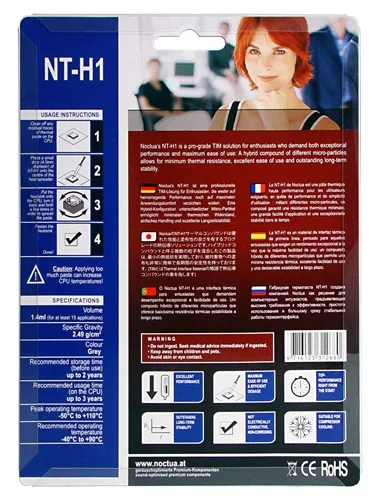 ПРОИЗВОДИТЕЛ : Noctua КОД НА ПРОИЗВОДИТЕЛЯ : NT-H1 ТИП : Термо-пастаПАСТА КОЛИЧЕСТВО : 3.5 gПЛЪТНОСТ : 2.49 g/cm3РАБОТНА ТЕМПЕРАТУРА : -50° ~ 110°ЦВЯТ : СивДОПЪЛНИТЕЛНИ : Не провежда електричествоБАРКОД EAN-13 : 4716123312680