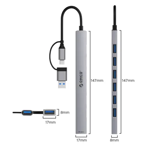 USB2.0-A x 6Х-КА 1 : Material: Aluminium Alloy + ABSХ-КА 2 : Data Cable Length: 16cmХ-КА 3 : Supported System: Windows/Linux/Mac OS/AndroidРАЗМЕРИ : 147 x 15 x 7 mmЦВЯТ : СивГАРАНЦИЯ : 24 месецаБАРКОД EAN-13 : 6942227136312