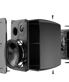The integrated amplifier can deliver a power of 2 x 40 Watt and includes a stereo line input which is implemented balanced and unbalanced, allowing convenient connection to any kind of audio source. Unbalanced audio sources are connected through a 3.5 mm jack connector, while balanced sources can be connected to the terminal block input connection allowing long signal runs without interference. A volume potentiometer allows the user to adjust the level of loudness while the two-band tone control allows equalization of treble and bass. The auto-standby mode reduces power consumption when no input signal is detected. The active speaker includes a stereo amplifier module, also delivering the input signal to the passive unit.
