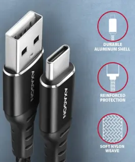 Premium connection USB-C USB-A Data and Charging AXAGON BUCM-AM10AB HQ USB 2.0 cable with USB-C male and USB-A male connectors. The cable is designed to data synchronization and charging phones, tablets and other mobile devices. It supports up to 480 Mb/s data transfer and charging with current up to 3A. The cable is compatible with charging technologies Quick Charge, Samsung AFC, Huawei FCP, SMART and others.