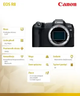 With built-in Wi-Fi connectivity and always-on Bluetooth 4.2, you can connect to smart devices, Wi-Fi networks and Лаптопs to share photos and videos with people watching and friends. In addition, you can control the EOS R8 remotely with your phone, process RAW files in the cloud and use the camera as a high quality webcam.