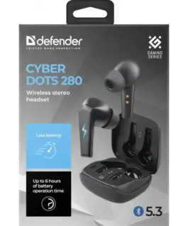 HEADPHONES DEFENDER BLUETOOTH CYBERDOTS 280 GAMING BLACK. Wireless stereo headset. Wireless gaming headphones with excellent sound, low sound delay and LED lighting of the housing and headphones. Working time up to 6 hours without charging. Instant connection to the phone. Съвместим с iPhone and Android devices.