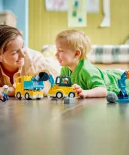 This LEGO DUPLO building set includes 22 pieces that can be used to build three sets of trucks: a loader with a blade that loads the truck with bricks, an excavator and a tow truck with a rotating arm, or a scissor lift and a second tow truck with a smaller hook for lifting bricks. Encourage young builders to use their creativity, problem-solving skills, perseverance, and fine motor skills to experiment with different solutions and create imaginative trucks.