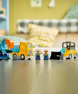 The set also includes two construction worker figures that little ones can put behind the wheel to operate the vehicles.