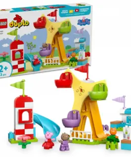 Fill playtimes with dynamic fun and adventure with the LEGO DUPLO Peppa Pig Funfair (10453) toddler toy. Preschoolers aged 2 plus pretend-play a day at an amusement park in the company of recognizable toy characters from their favorite show. Theyll love to send the Peppa Pig, Candy Cat and Danny Dog figures spinning as they push this preschool playsets rotating Ferris wheel. Then they can play out taking turns to whiz down the slide toy.
