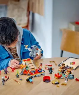 This buildable ninja toy for kids comes with 6 NINJAGO minifigures. Ninja Kai and Sora, in their tournament armor and with never-before-seen short katana sword accessories, battle a collection of villains: Cinder, a Wolf Mask Warrior and, exclusive to this set, Evil Jay and Tox.