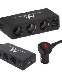 Car Charger with USB 2 -port and 3 – car cigarette lighter sockets . Smart IC auto- detection voltage. Charge 2 USB devices at the same time. fast, efficient charging with 4.8 A. Power On / Off with LED indicator. Cable car load of 1 m . Rubber grip for a steady load . Surface finish with stain resistant treatment. Protection against excess voltage and current . 2x adhesive double sided 3M sticker for fixation.