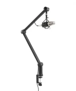 Professional microphone mount characterized by high stability and solid construction. They can be rotated 360° and easily positioned thanks to two arms. Supports microphones weighing up to 1 kg. Very easy installation without drilling. Integrated cable management system. Perfect for radio, broadcast, studio and home use. 3/8 and 5/8 adapters