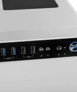 MODECOM OBERON GLASS from among other casings for players is distinguished by an elegant, minimalist design, highlighted by classic black. The classic front panel is broken with modern solutions in the form of top connectors with four USB ports, chromium-plated audio inputs (headphones, microphone), backlit power button and vertical grids masking the air inlets along the sides. On one of the side panels of the OBERON GLASS housing, we placed a window displaying the inside of the computer made of tempered glass.