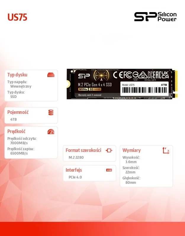 Silicon Power SSD drive US75 4TB M.2 PCIe Gen4x4 NVMe 1.4 7000/6500 MB/s