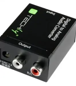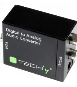 – Conversion of digital audio from coaxial RCA or optical Toslink (S/PDIF) to analog RCA L/R audio signal