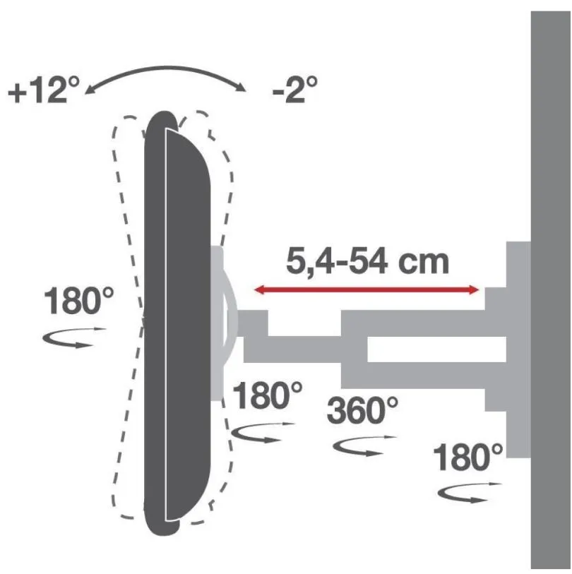 Many other mounts that can tilt forward and also swivel/tilt left and right are quite large and cannot be folded very compactly, making it difficult to position the TV close to the wall. This mount does not have this problem: it can be folded down to 54 mm from the wall .