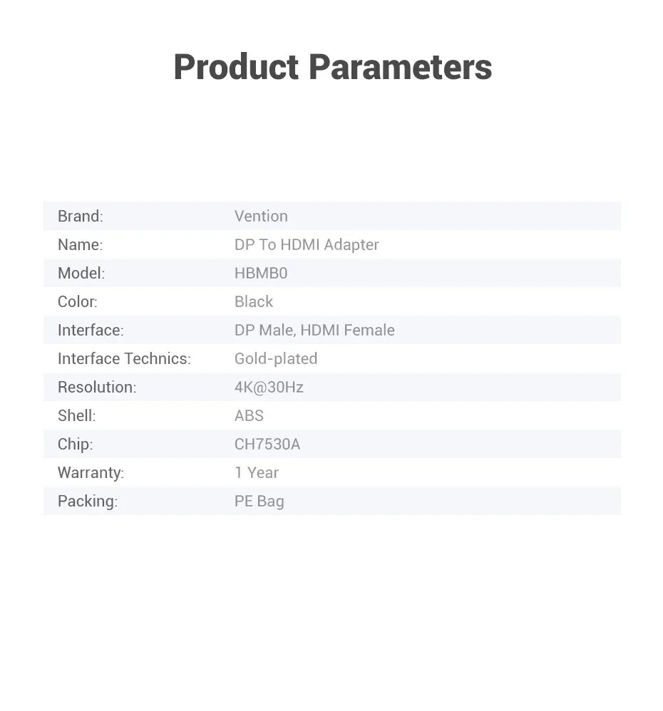 ПРОИЗВОДИТЕЛ : Vention КОД НА ПРОИЗВОДИТЕЛЯ : HBPB0 ТИП : ПреходникКОНЕКТОР 1 : DisplayPort
